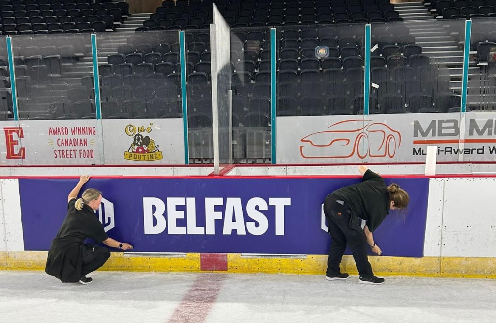 Signs Express Belfast has been supplying rink side advertising solutions to the Giants since the team’s inception 25 years ago. For this project, the challenge was that the graphics were needed only for Champions Hockey League games, requiring a solution that could be easily overlaid on the permanent league graphics and removed afterwards without causing any damage.